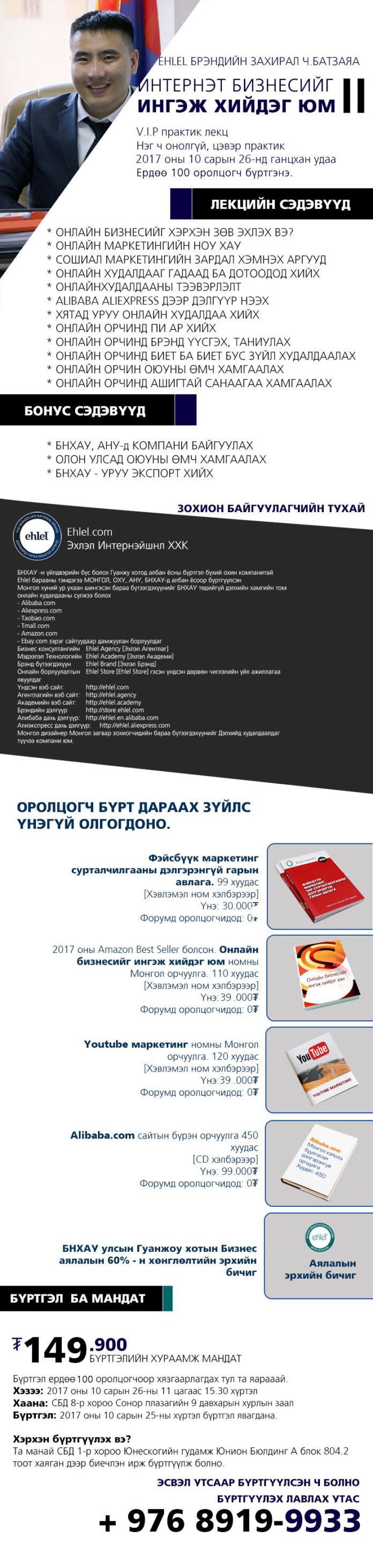 “Эхлэл” брэндийн захирал Ч.Батзаяа “Интернэт бизнесийг ингэж хийдэг юм” сэдэвт нэг ч онолгүй, цэвэр практикт суурилсан V.I.P лекцээ 2017 оны 10 сарын 26-нд ганцхан удаа явуулахаар болжээ. Сургалтанд нийт 100 хүн хамрагдах боломжтой.
