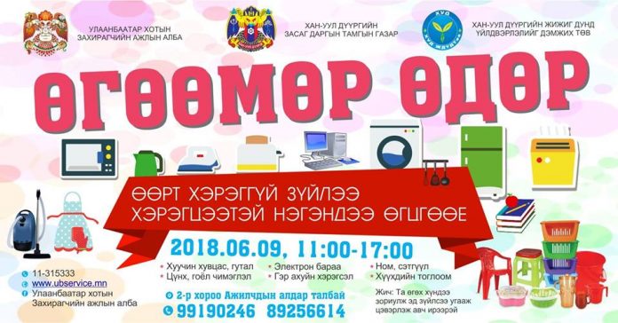 Улаанбаатар хотын Захирагчийн ажлын алба, Хан-Уул дүүргийн Засаг даргын Тамгын газар, Хан-Уул дүүргийн Жижиг дунд үйлдвэрлэлийг дэмжих төв хамтран “ӨӨРТ ХЭРЭГГҮЙ ЗҮЙЛЭЭ ХЭРЭГЦЭЭТЭЙ НЭГЭНДЭЭ ӨГЦГӨӨЕ” уриатай арга хэмжээг 2018 оны 06 дугаар сарын 09-ны өдөр 11 цагаас 17 цагийн хороонд Хан-Уул дүүргийн 2-р хороо “АЖИЛЧДЫН АЛДАР ТАЛБАЙ”-д зохион байгуулах гэж байна.