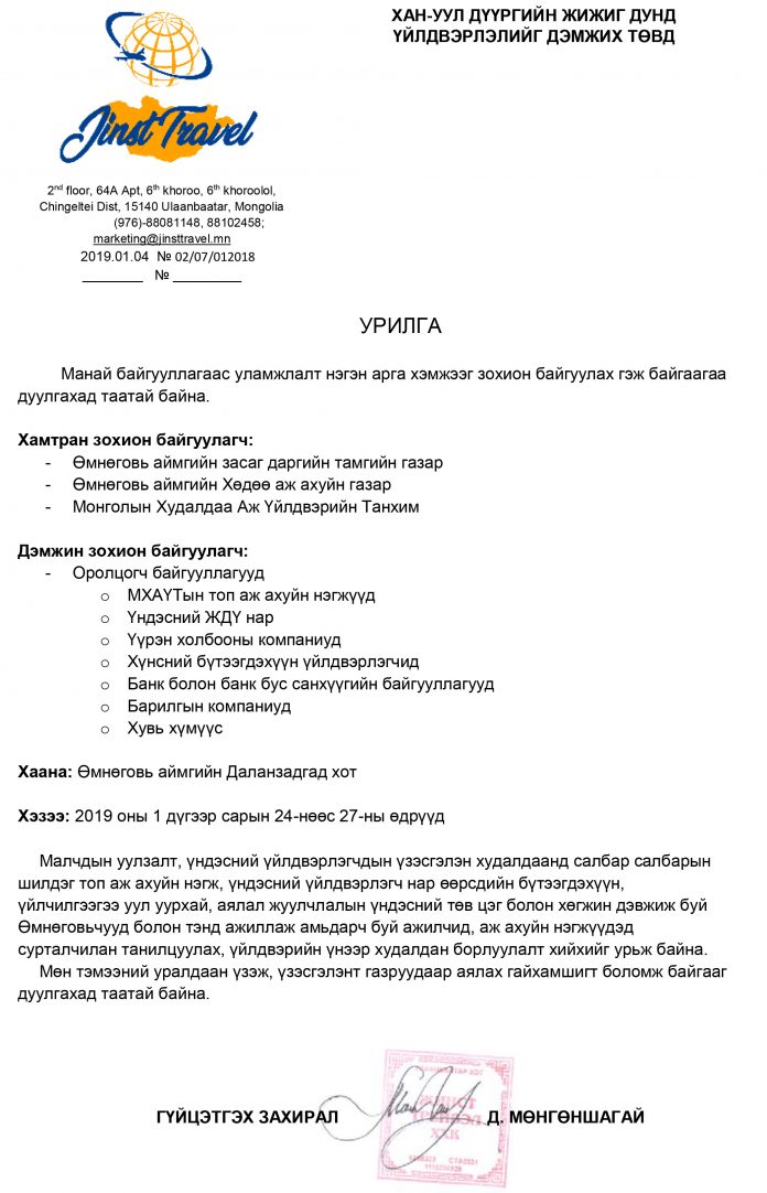 Мэдээ Арга хэмжээнд оролцохыг урьж байна. гэхэд admin - 2019-01-04 0 2607 Facebook дээр эзлэх хувь Twitter дээр жиргэдэггүй Холбоо барих: Д.Уранчимэг/88102458/ Оффис, аялалын менежер ЖИНСТ ТРЕЙВЭЛ ХХК