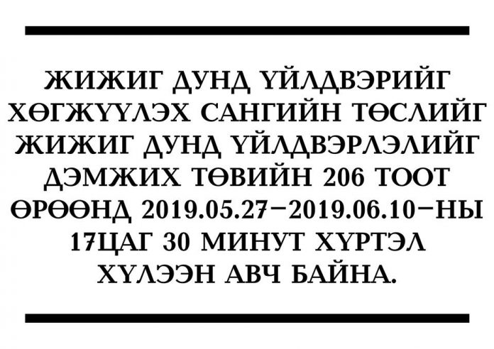Uncategorized ЖИЖИГ ДУНД ҮЙЛДВЭРИЙГ ХӨГЖҮҮЛЭХ САНГИЙН ТӨСӨЛ ХҮЛЭЭН АВЧ БАЙНА гэхэд admin - 2019-05-28 0 1573 Facebook дээр эзлэх хувь Twitter дээр жиргэдэггүй